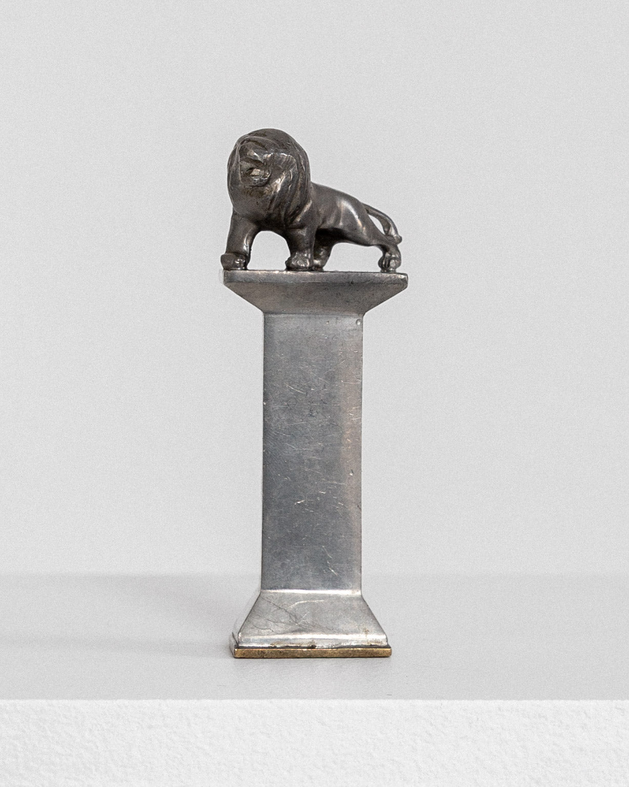 Art Deco seal stamp, crafted in 1930s Sweden by royal purveyor Ernst Svedbom for his own studio. This piece features a solid pewter column on a brass base, creating a subtle yet sophisticated contrast in materials. The column is topped with a finely detailed roaring lion. While made as a seal stamp, its sculptural quality works equally well as a decorative object alongside other pieces on a desk or shelf.