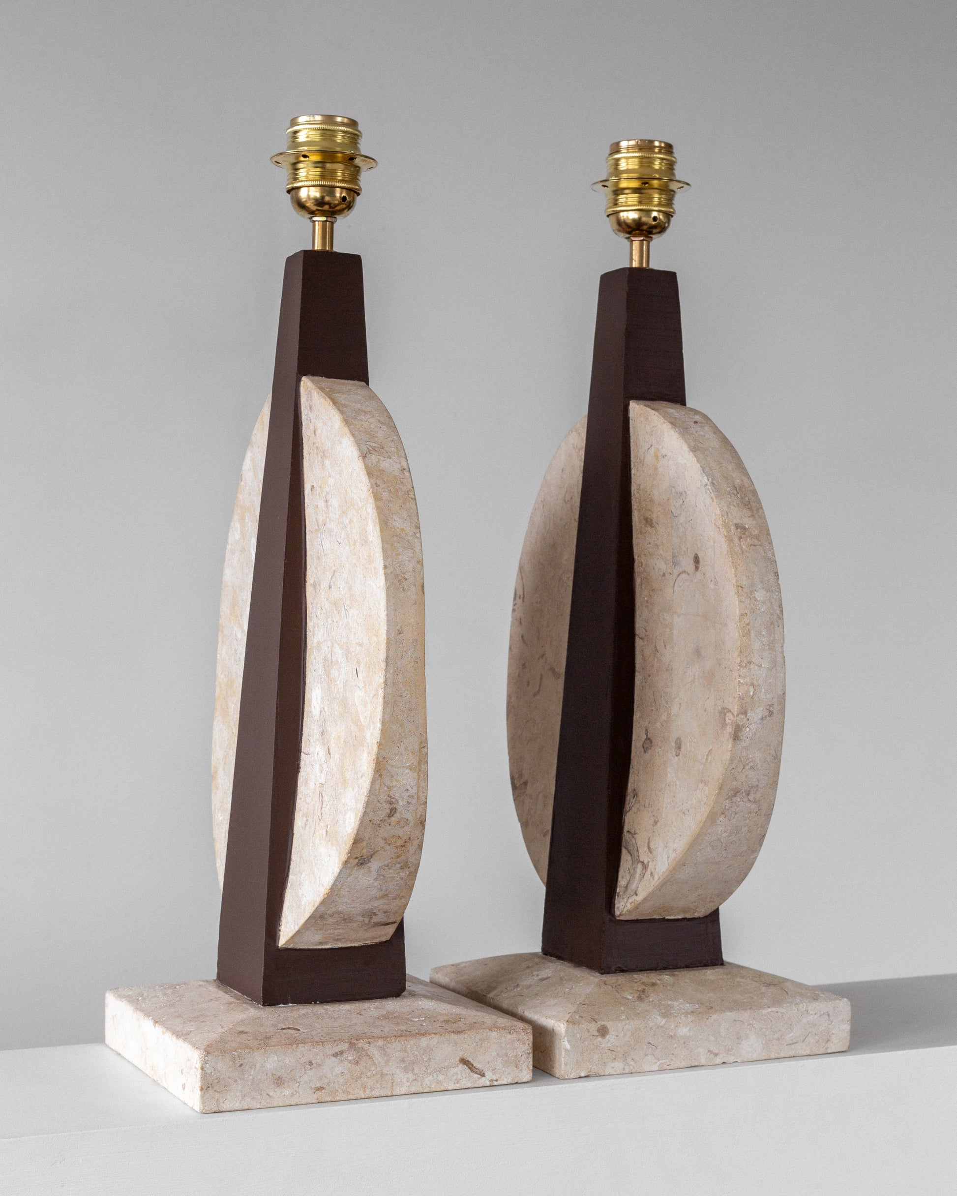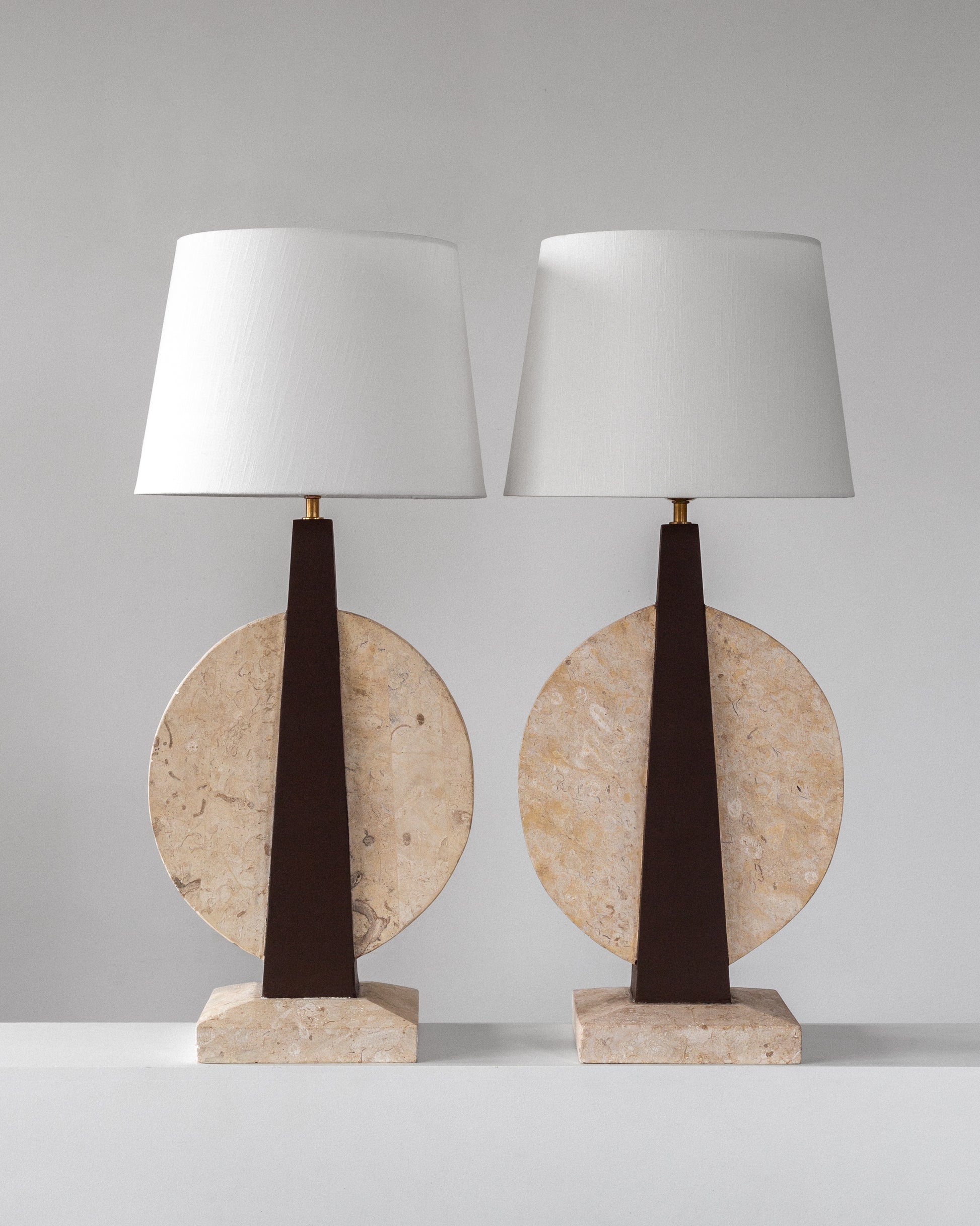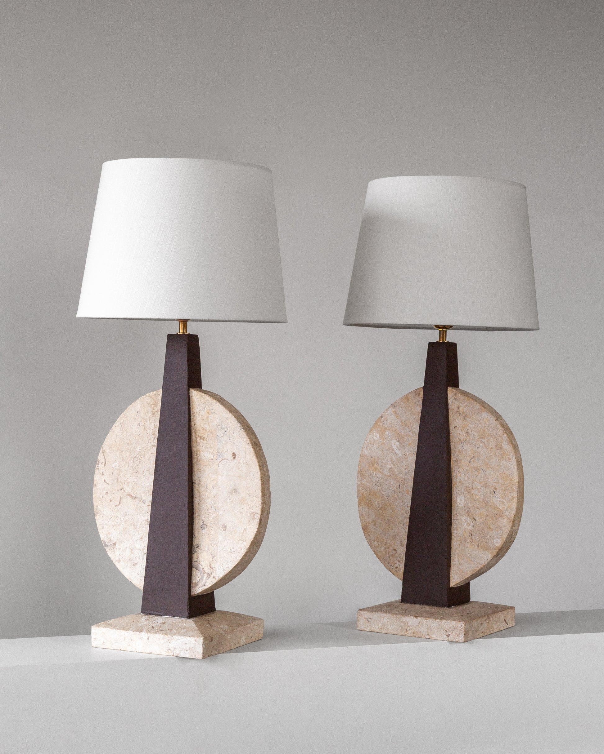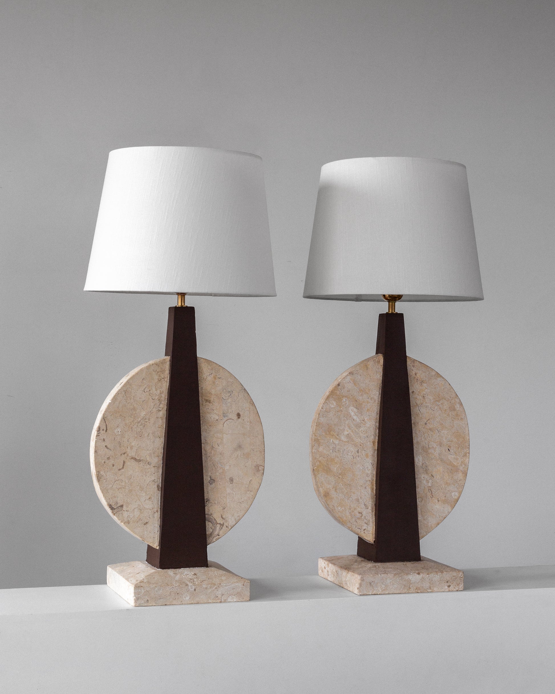A striking pair of table lamps, crafted in the USA during the 1970s. Sculptural in form and dramatic in contrast, each lamp features a travertine base and circular accent that beautifully highlights the stone's natural texture and veining. The central body is crafted from wood, painted in a rich brown hue that perfectly complements the creamy travertine elements. Each lamp is topped with a crisp white linen shade and has been updated with fresh wiring, a European plug, and a brass E-27 fitting, ensuring they are ready for modern use.