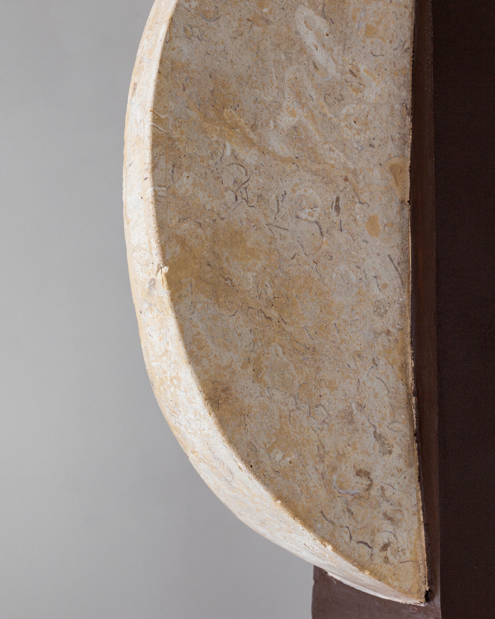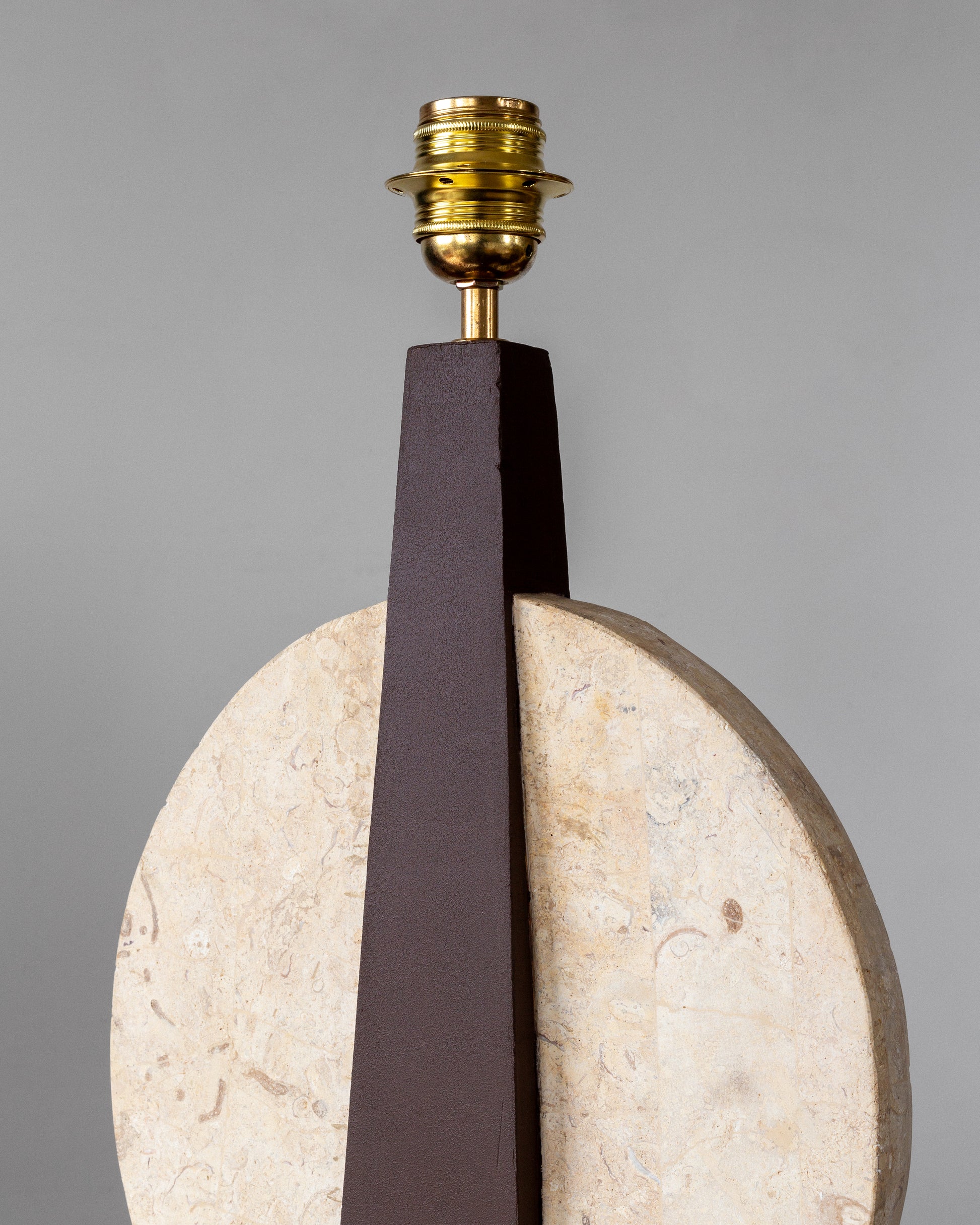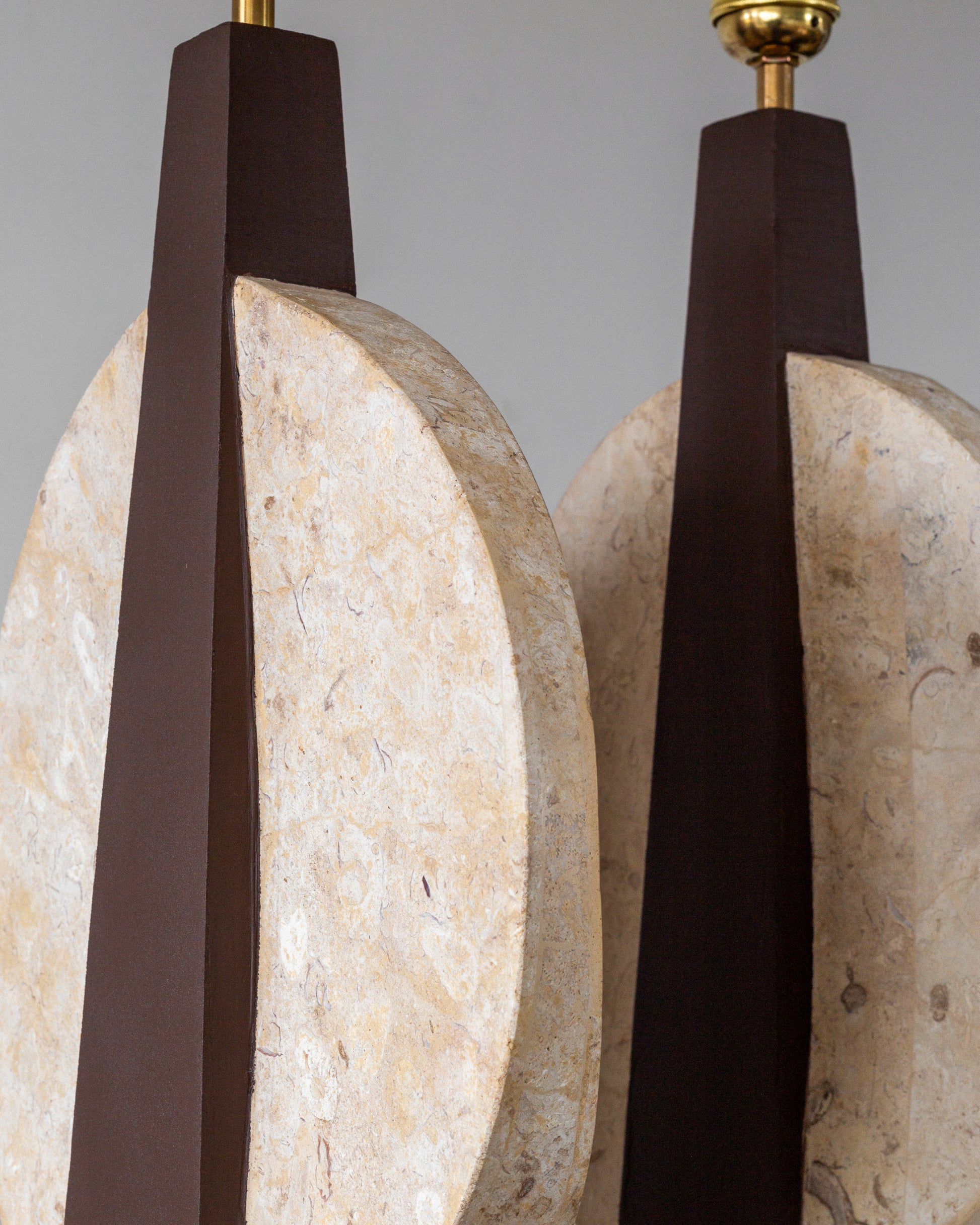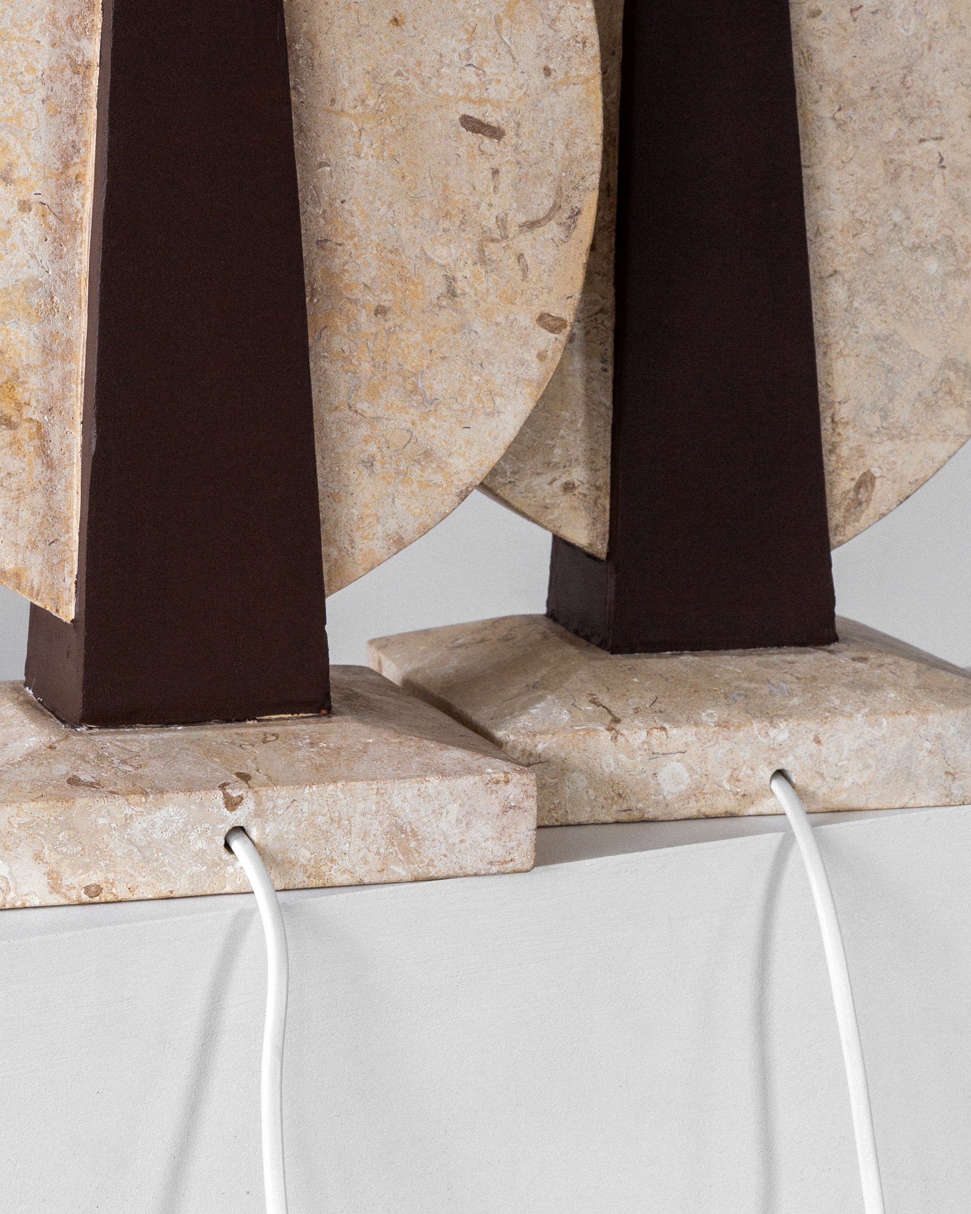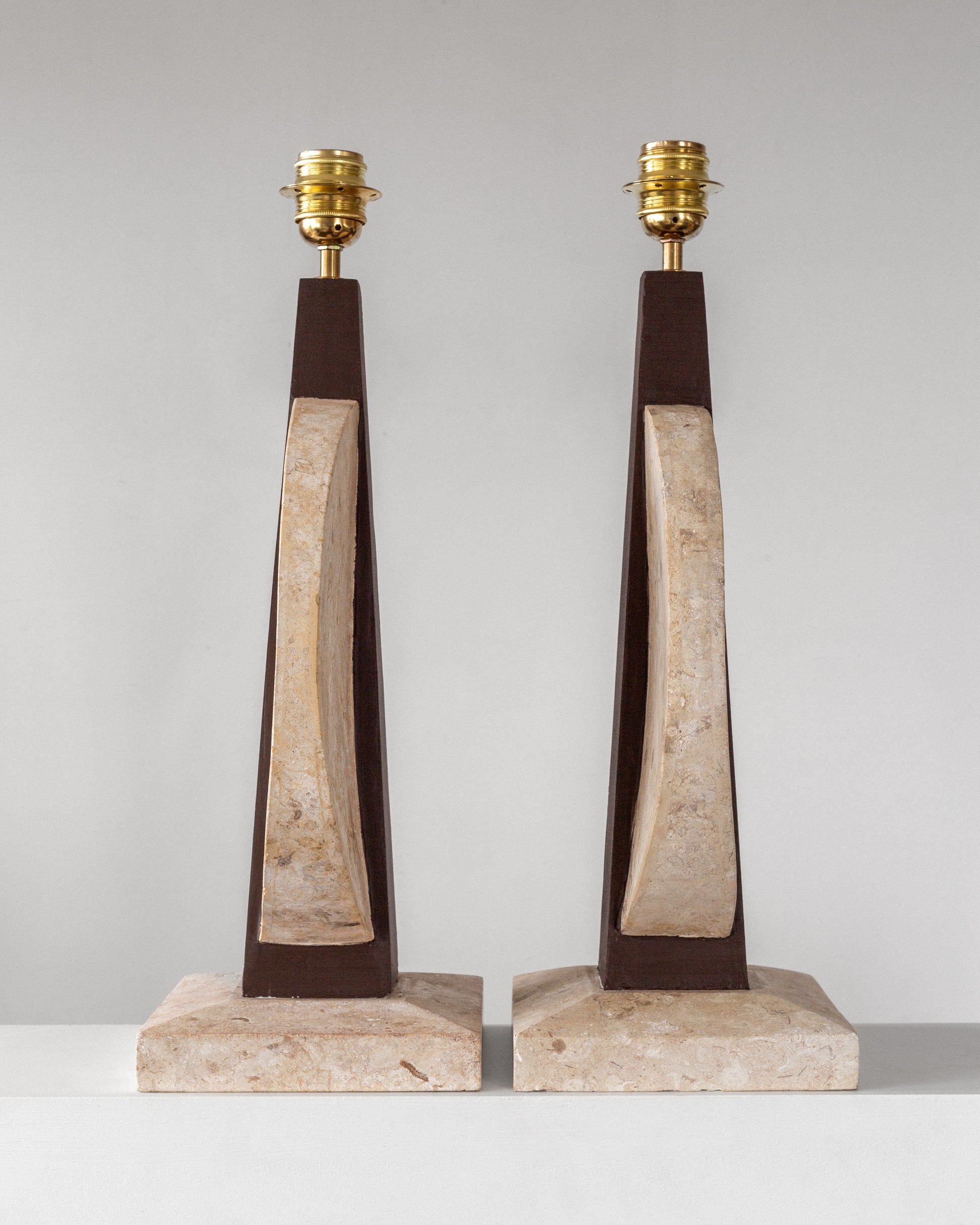A striking pair of table lamps, crafted in the USA during the 1970s. Sculptural in form and dramatic in contrast, each lamp features a travertine base and circular accent that beautifully highlights the stone's natural texture and veining. The central body is crafted from wood, painted in a rich brown hue that perfectly complements the creamy travertine elements. Each lamp is topped with a crisp white linen shade and has been updated with fresh wiring, a European plug, and a brass E-27 fitting, ensuring they are ready for modern use.