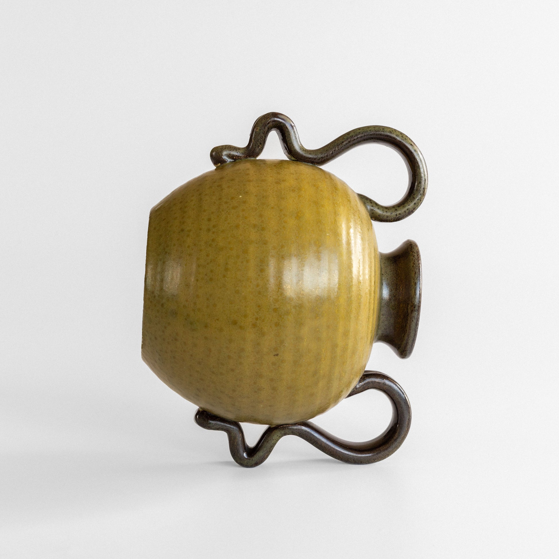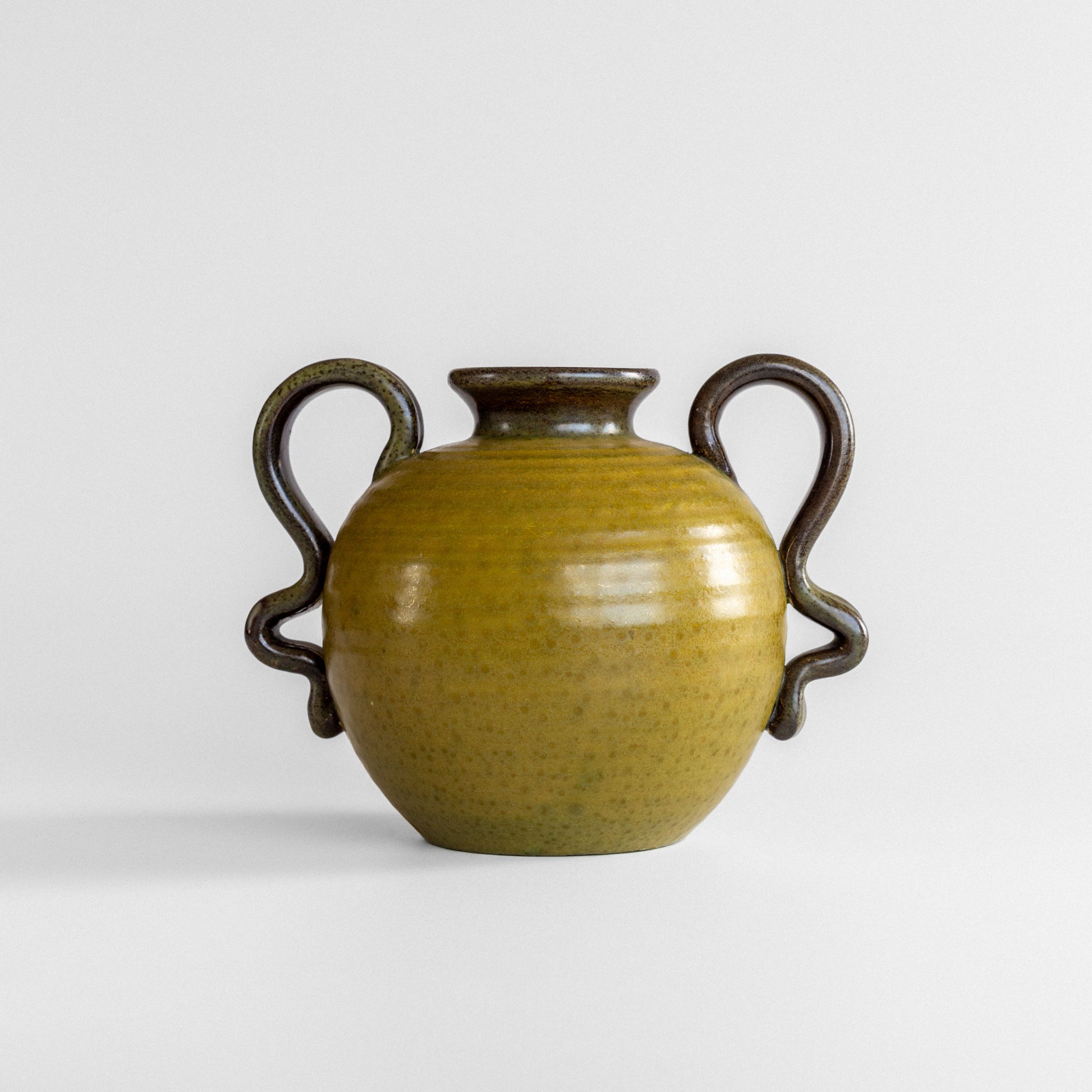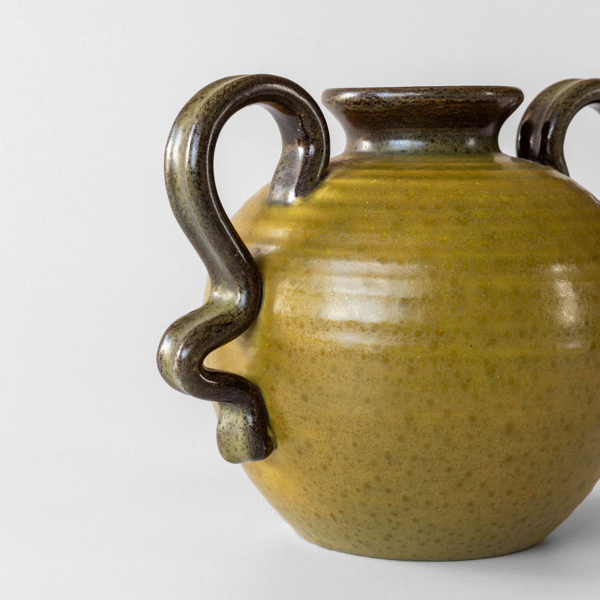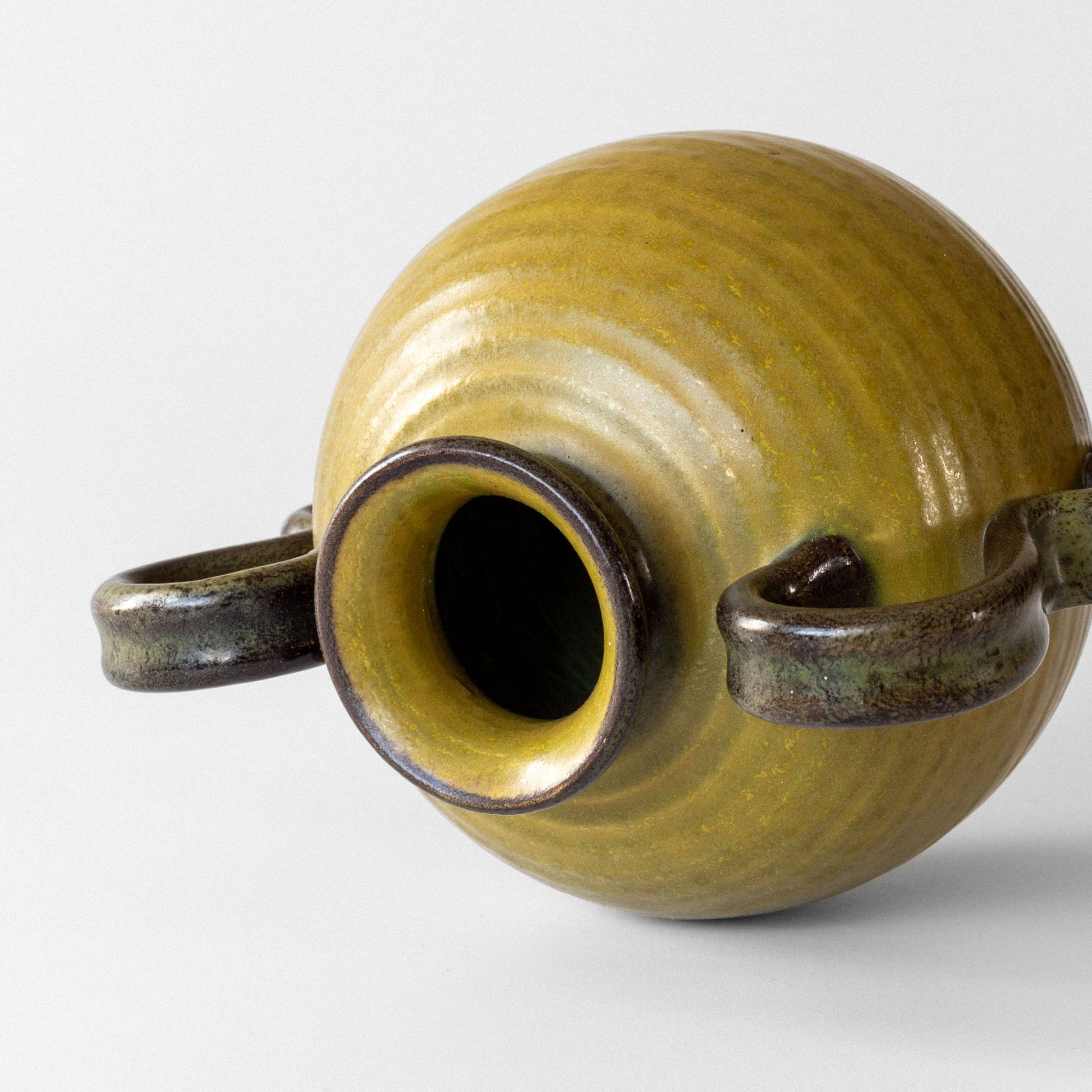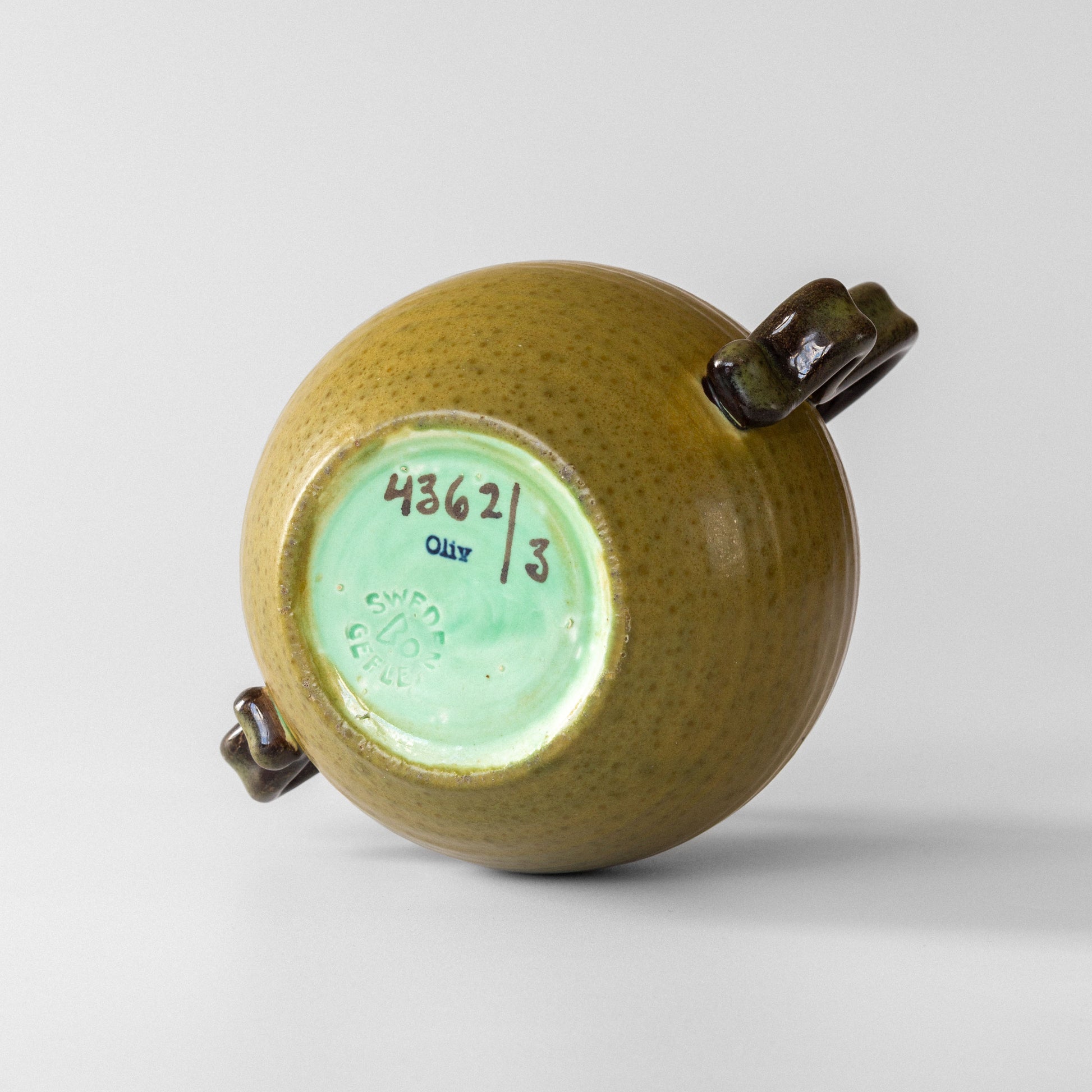 Swedish earthenware vase created by Eva Jancke Björk (1882-1981) for Bo Fajans during the 1940s. This spherical piece features two elegantly curved handles and a short fluted neck. Finished in Bo Fajans' "Oliv", marked as such on the underside, with a subtle semi-glossy surface that showcases the natural variations in the green coloration.