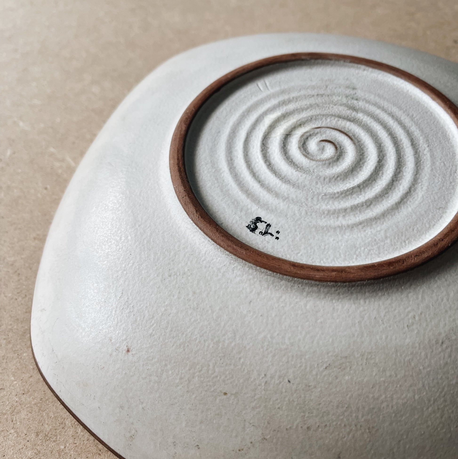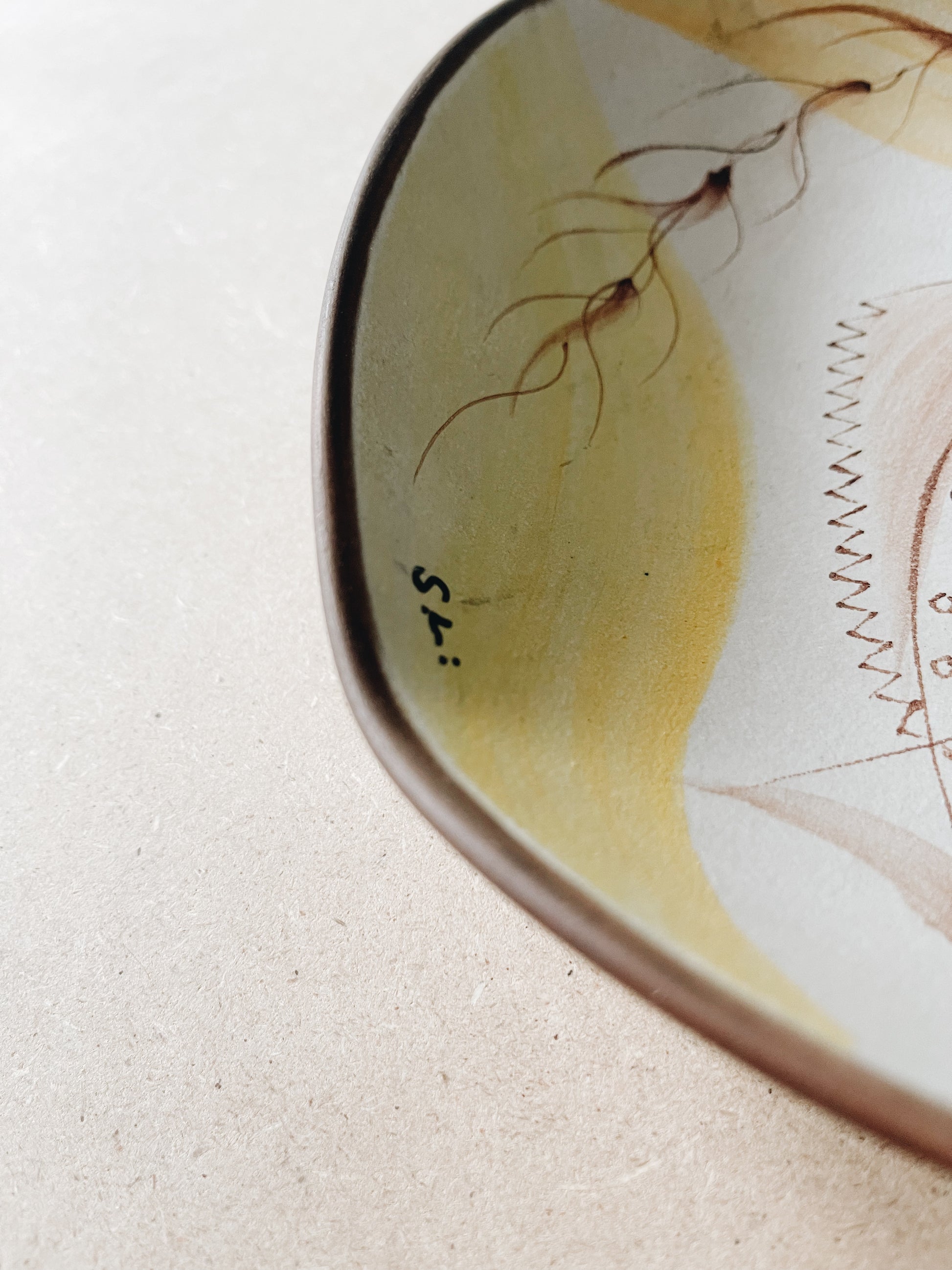 Stunnig ceramic plate/bowl with hand painted sea life decor. Made by an artist unkown to us, but someone who's noticeably trained and skilled. Take note of the how playful and well excecuted the decor is, how the shape of the brim goes up and down, and that there's even a relief pattern on the base. A ceramic piece with artistic intensions far beyond the ordinary.