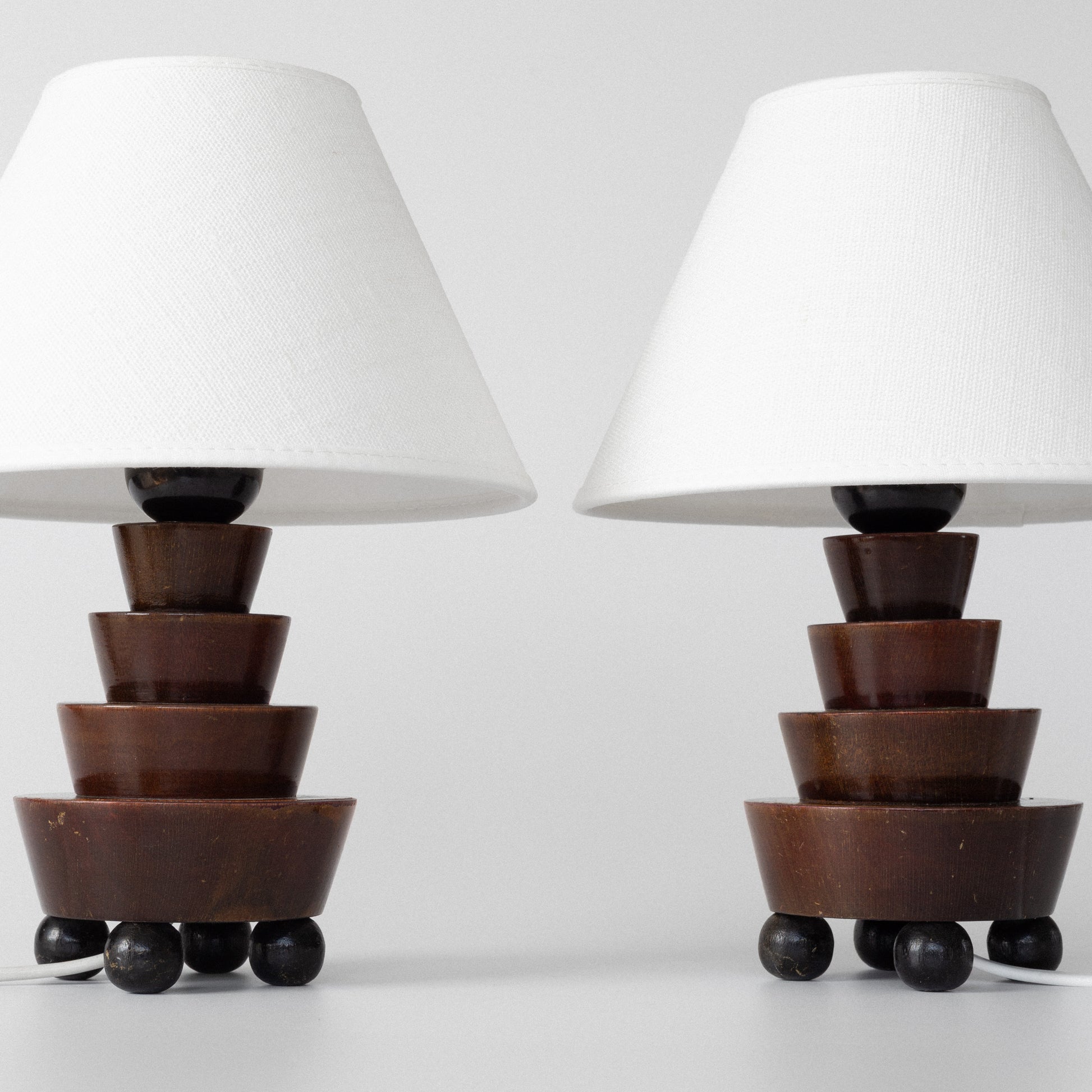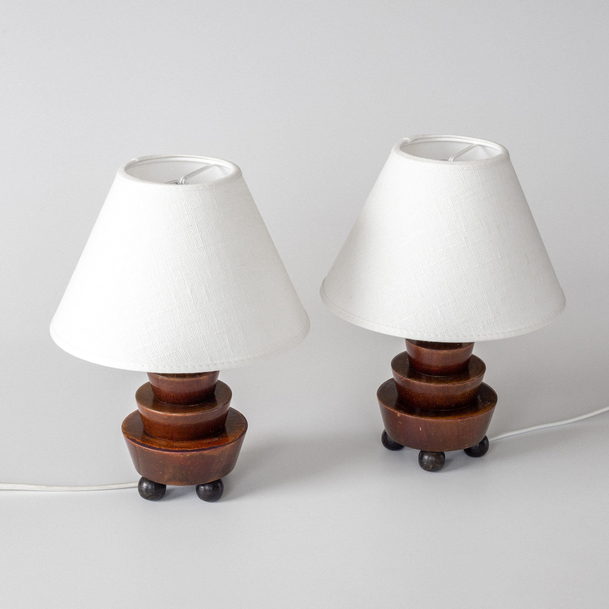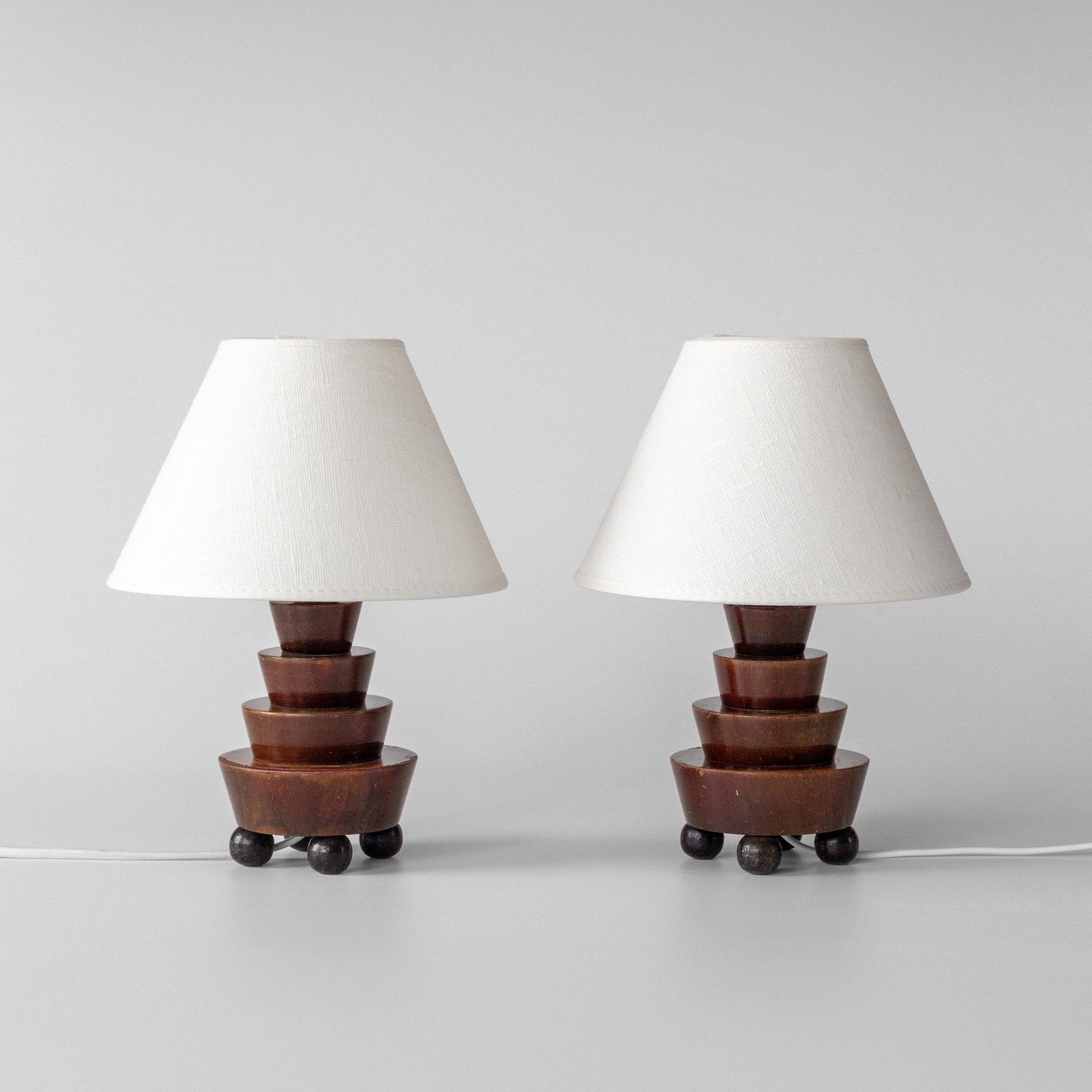 Striking pair of small sculptural wooden table lamps, likely Swedish, dating to the 1930s. Featuring a stepped geometric base characteristic of the Art Deco era, each lamp rests on four spherical feet and is topped with a new off-white linen shade. A warm, characterful addition to any refined interior.