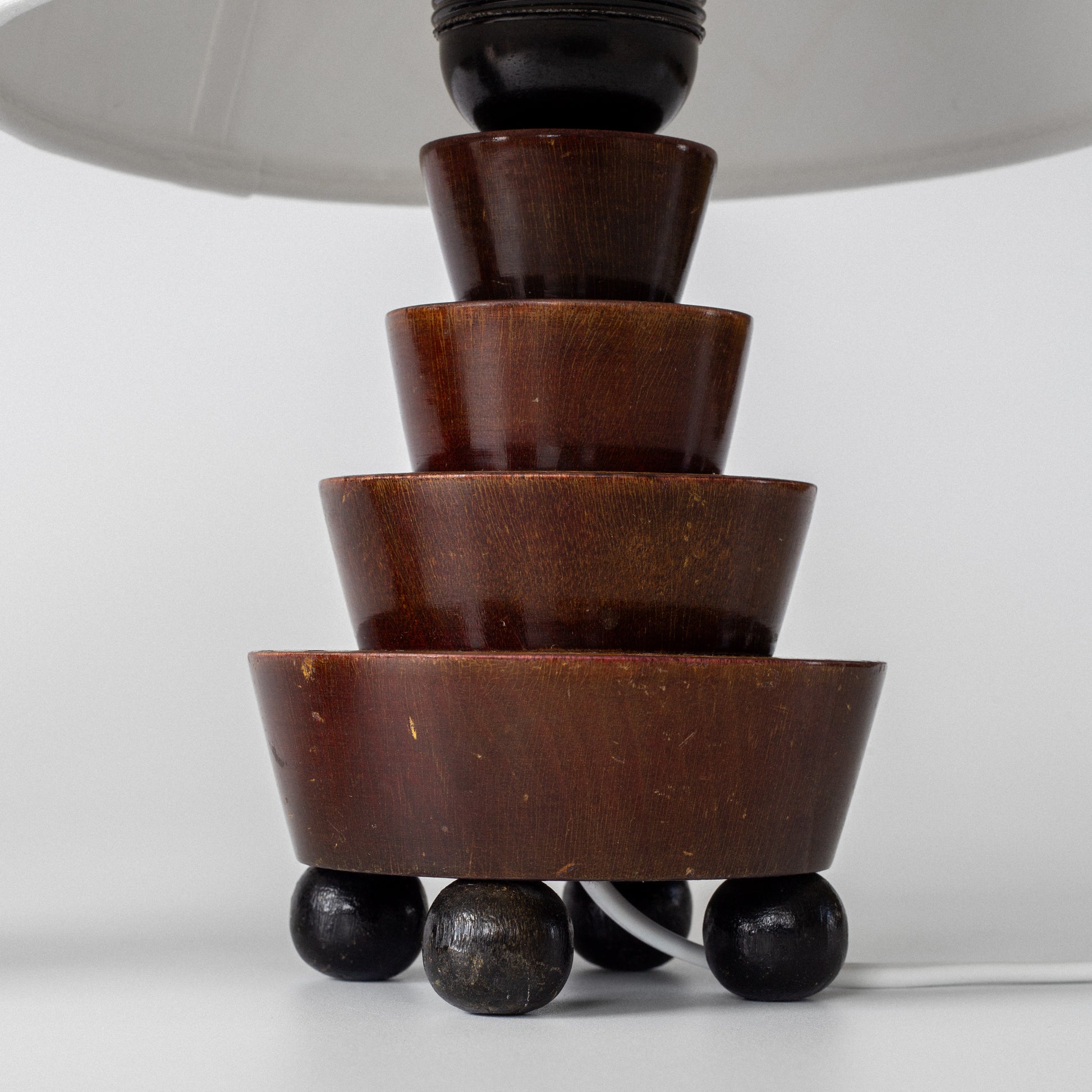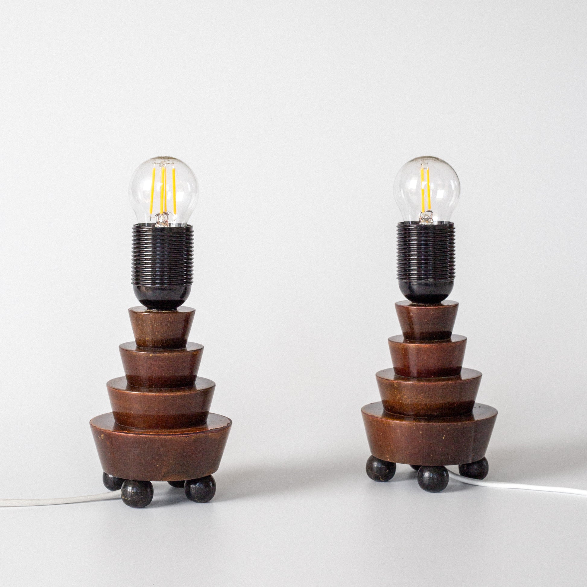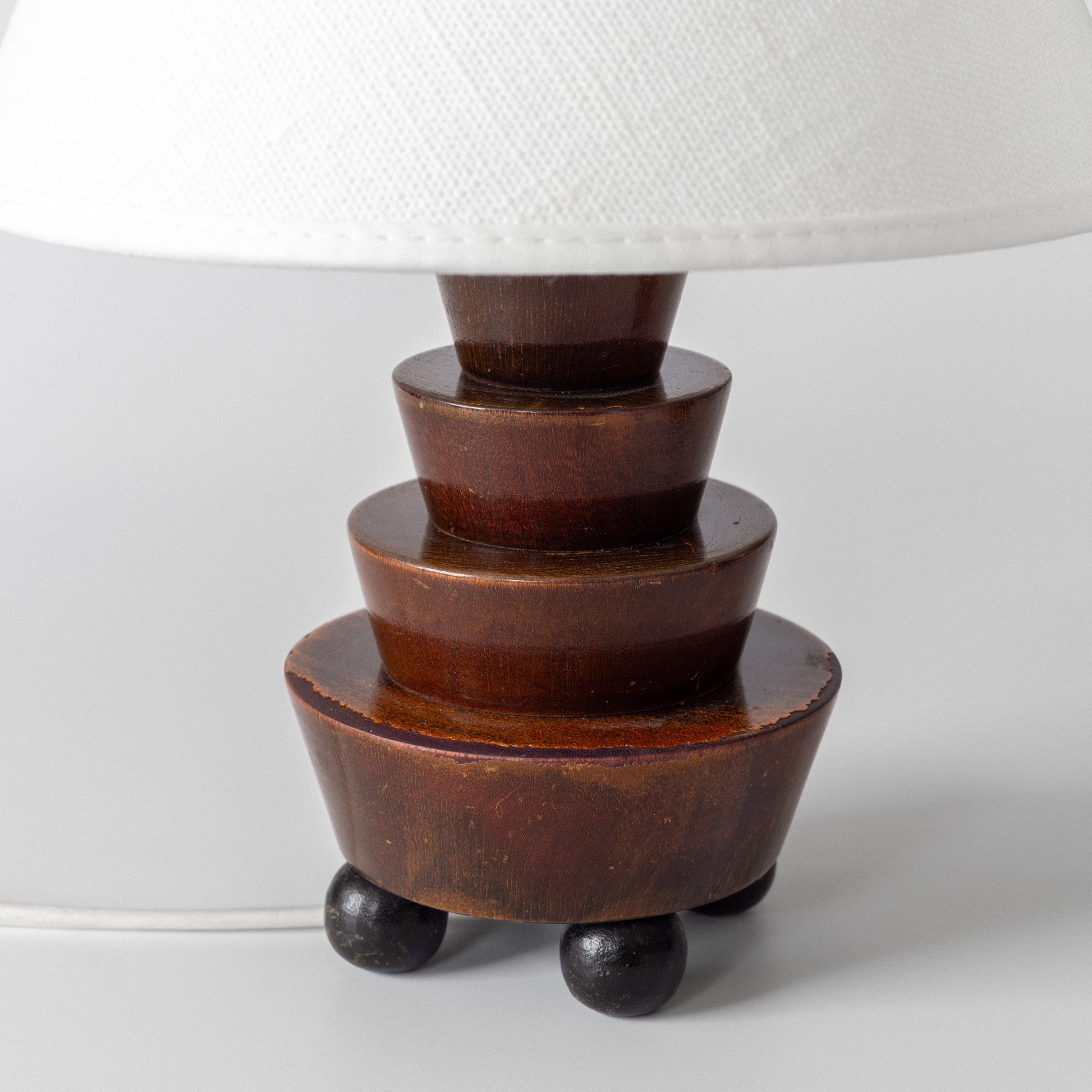 Striking pair of small sculptural wooden table lamps, likely Swedish, dating to the 1930s. Featuring a stepped geometric base characteristic of the Art Deco era, each lamp rests on four spherical feet and is topped with a new off-white linen shade. A warm, characterful addition to any refined interior.
