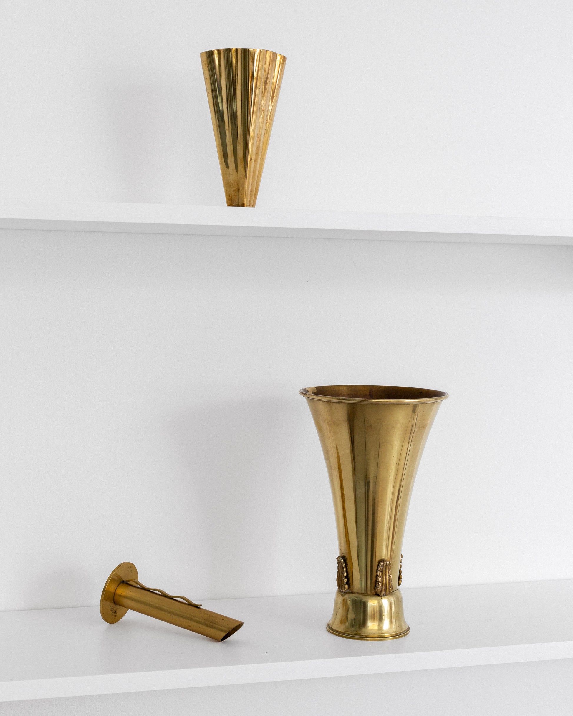 The "Kungavasen" (King's Vase) by Ystad-Metall, Sweden, 1930s. Crafted in brass with an elegant tapered form and decorative leaf motifs at the base. The vase displays a beautiful, subtle patina developed naturally over time.