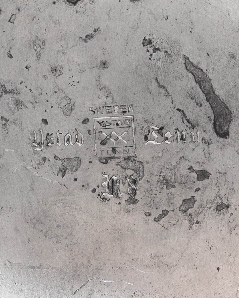 Made from pewter with a lovely patina that develops naturally over time. The piece is marked with "Ystad Brons" and the pewter hallmark "D8" confirming it was made in 1938.