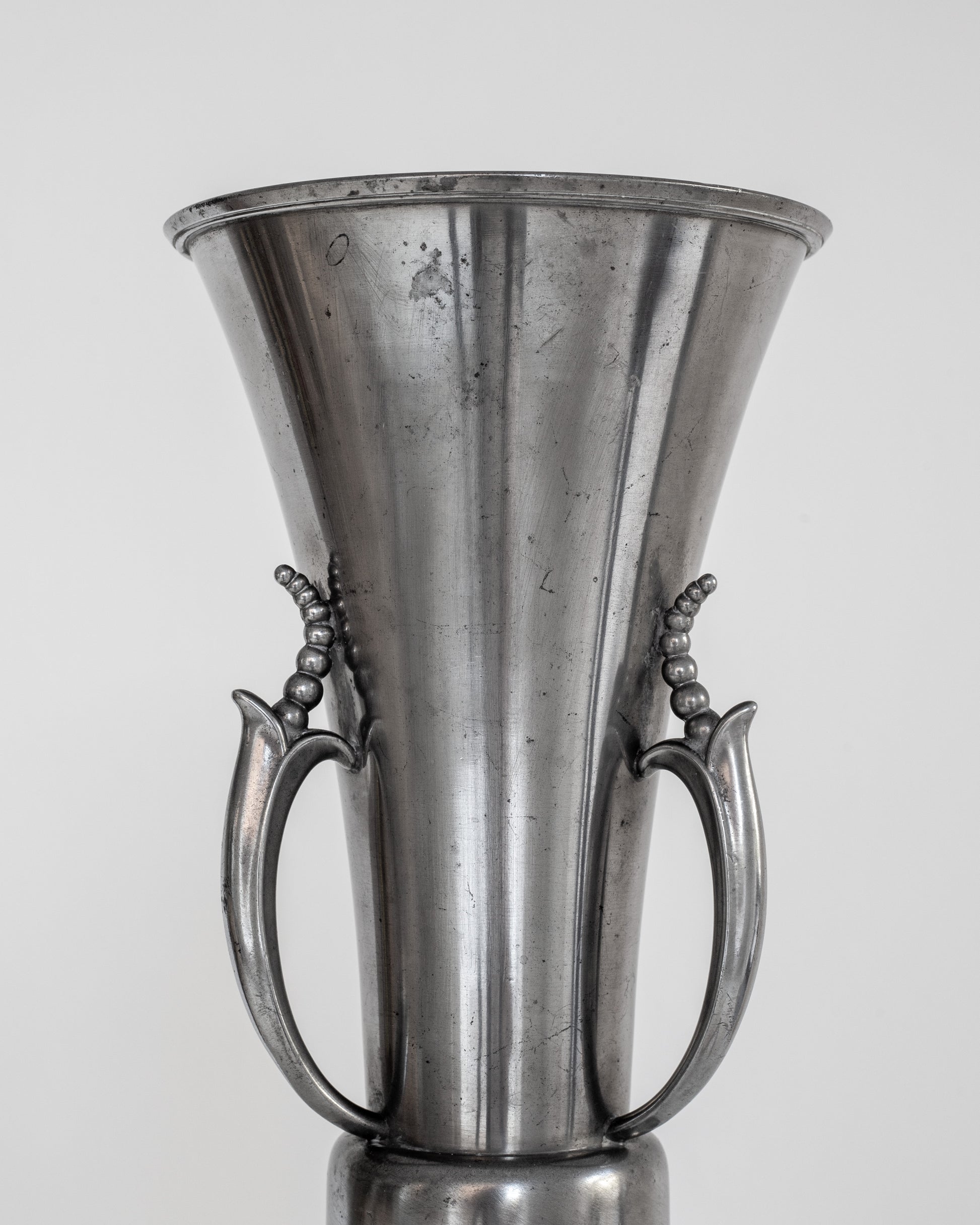 A beautiful example of Swedish decorative arts from the 1930s. Crafted by Ystad Metall, the vase has a classic conical shape with three curved handles decorated with small beaded details.